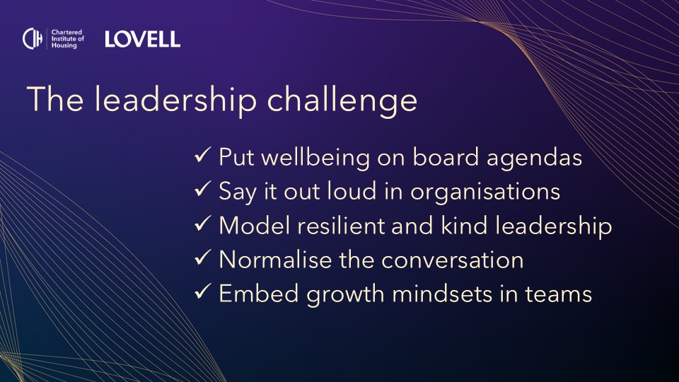 Building resilience in housing means that we develop and support a culture that makes wellbeing a strategic priority – we need positive cultures to be created, and people need to feel supported, valued and connected.